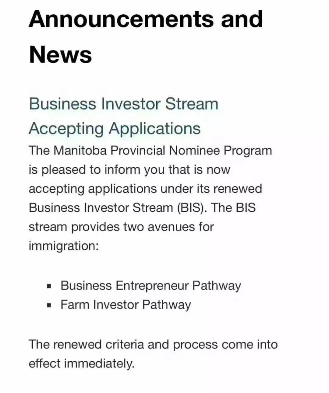 加拿大曼尼托巴省,即曼省移民部门在5月18日宣布更新之后的新版本商业投资者类别(简称:BIS)开始接受申请!