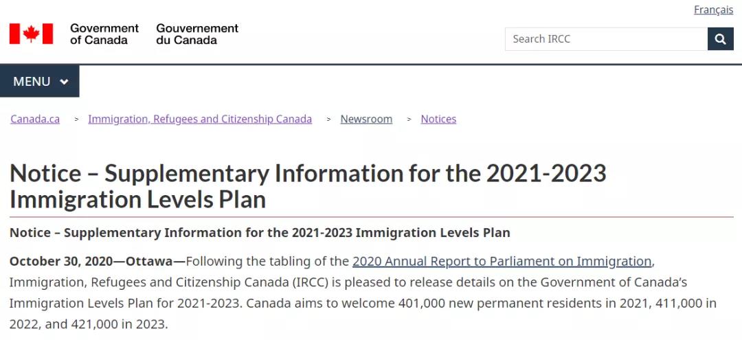 2020年10月30号,加拿大公布了2021-2023年接收移民的计划,将把移民目标定在其历史上的最高水平。