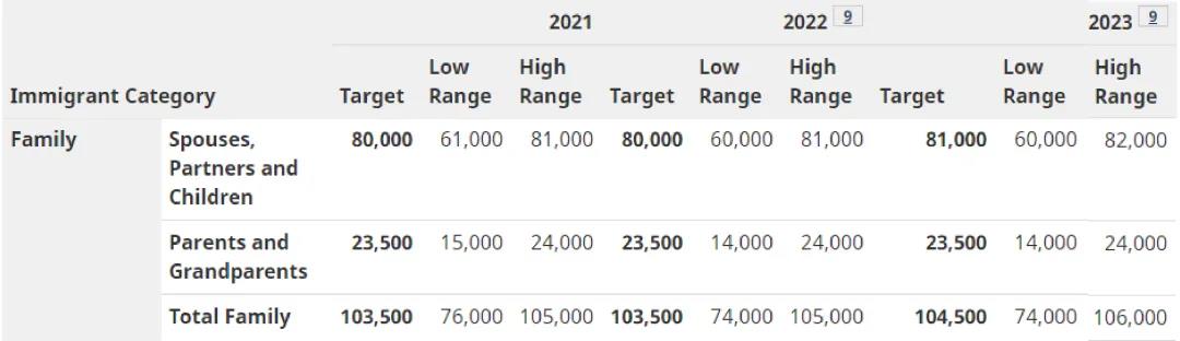 其中父母和祖父母团聚的人数在2021年、2022年和2023年维持不变;配偶和子女团聚移民在2021年和2022年维持不变,2023年人数增加1,000人,有104,500人。