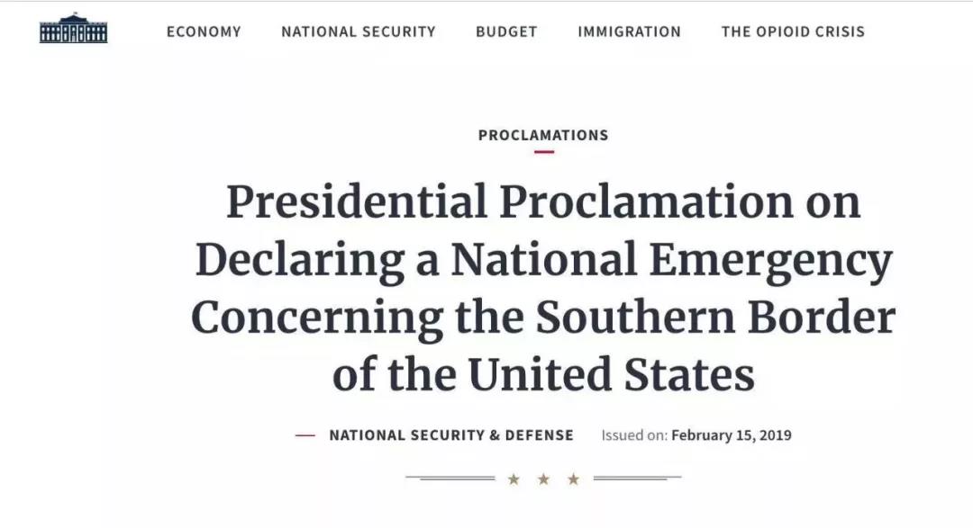 总统宣布签署全国进入紧急状态行政令,使用行政权力绕过国会,为边境墙筹集更多资金。这一紧急行政令使得总统可以在未经国会的允许下,动用80亿美元资金用于修建边境墙。