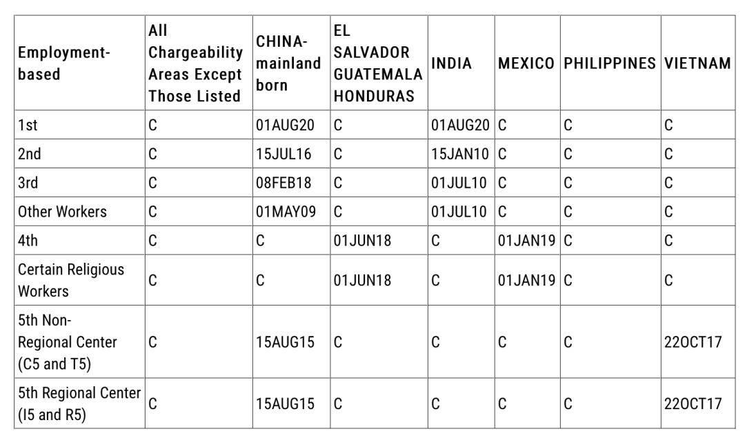职业移民排期表A(Final Action Dates for Employment-Based Preference Cases)说明当申请人的优先日(Priority Date)早于排期表上的截止日的,申请人或受益人绿卡有名额。具体请看下表: