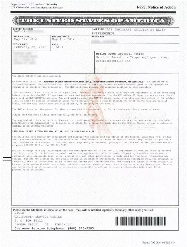 2016年2月,收到通过函,获得美国移民申请(简称I-526批准);