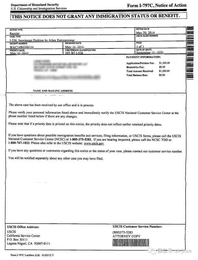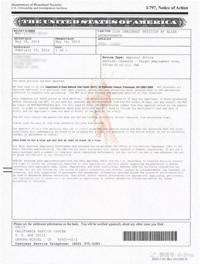 2016年2月,获得美国移民局批准(简称:I-526批准)