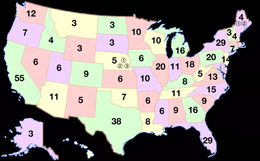 美国一共有50个州,而各州根据人口数量的多少各自拥有不同数量的选举人票。比如人口最多的加利福尼亚州就拥有55张选举人票,而那些人口少的州,最少也会有3张选举人票。