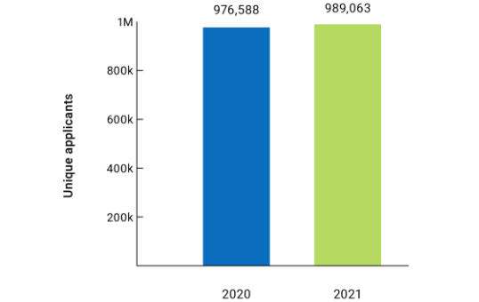 989,063名申请学生至少提交了一份申请,比上学年同期增加1%;