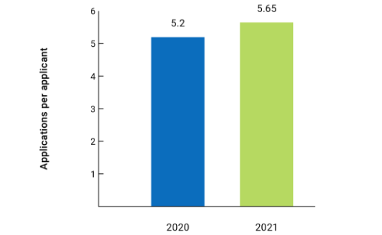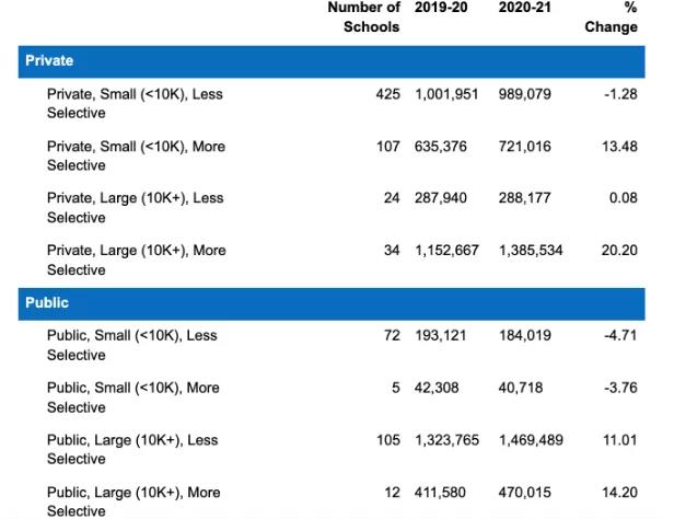 据里卡德表述:与2019-2020学年相比,来自规模较大的大学(学生人数超过2万人)的申请增加了16%,而来自规模最小的大学(学生人数不到1000人)的申请减少了4%。此外,高选拔率(录取率低于50%)的大学的申请人数比低选拔率的大学增加得更多。