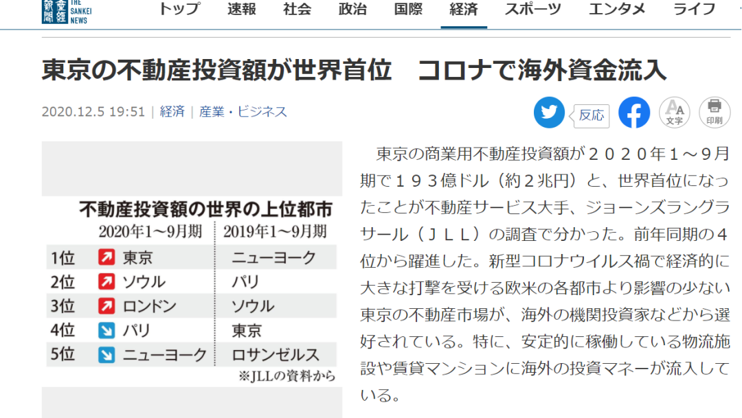 据《产经新闻》12月15日报道,2020年1月至9月,东京的房地产投资达到193亿美元,居世界首位,比去年同期的第四位有了惊人的增长。