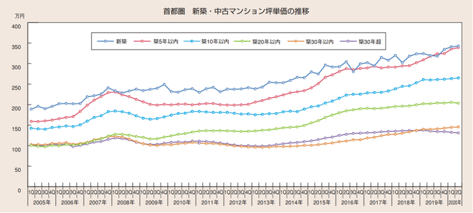 日本SUUMO关于首都圈新建公寓和二手公寓每坪单价的变动情况统计数据