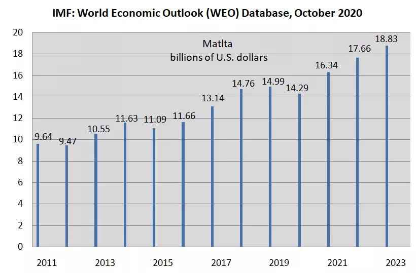 此外,在2019年-2020年,受到疫情的影响,全球经济趋势整体下滑,马耳他的经济总量:2019年,创造的GDP为151.3亿美元,2020年截至到11月底GDP为142.9亿美元(IMF)。