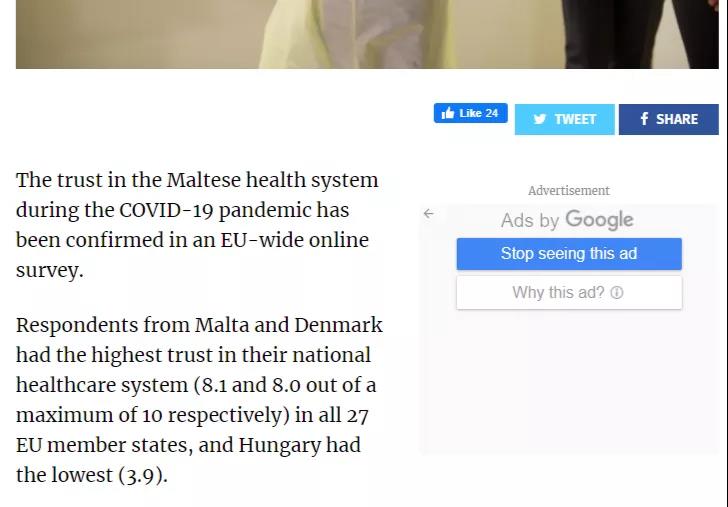 在Eurofound进行的问卷调查显示,在所有27个欧盟成员国中,马耳他和丹麦的受访者对本国卫生保健系统的信任度最高(分别为8.1和8.0),这反映了马耳他在抗击这一流行病方面的有效性。