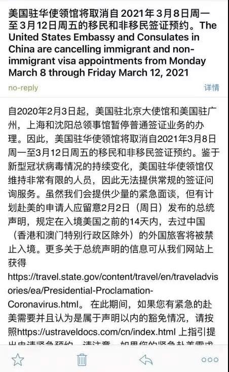 取消所有领馆2021年3月8日(周一)至2021年3月12日(周五)的移民和非移民签证预约。