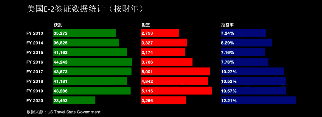 但是,我们可以看看整体2020财年美国非移民签证的综合拒签率,约为25%,与上一财年是基本持平的,是E-2签证拒签率的2倍多。
