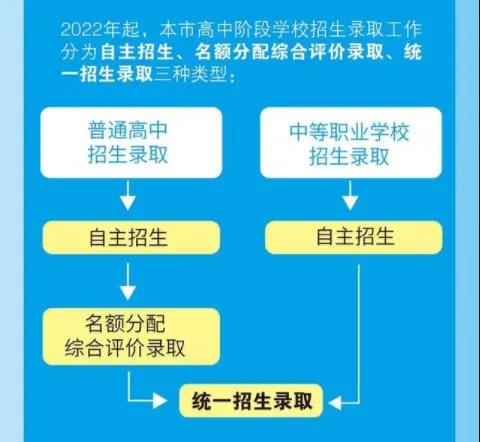 根据新政,从2022年起,本市高中阶段学校招生录取工作分为自主招生、名额分配综合评价和统一招生三种类型。