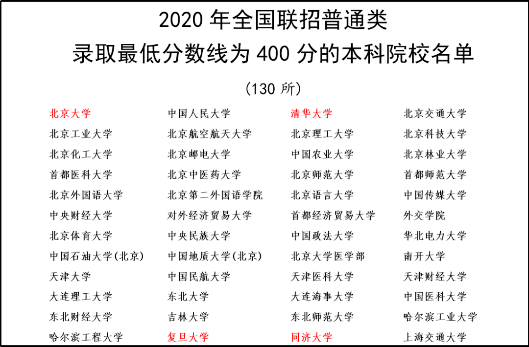 2020年130所联考分数线400分的院校名单