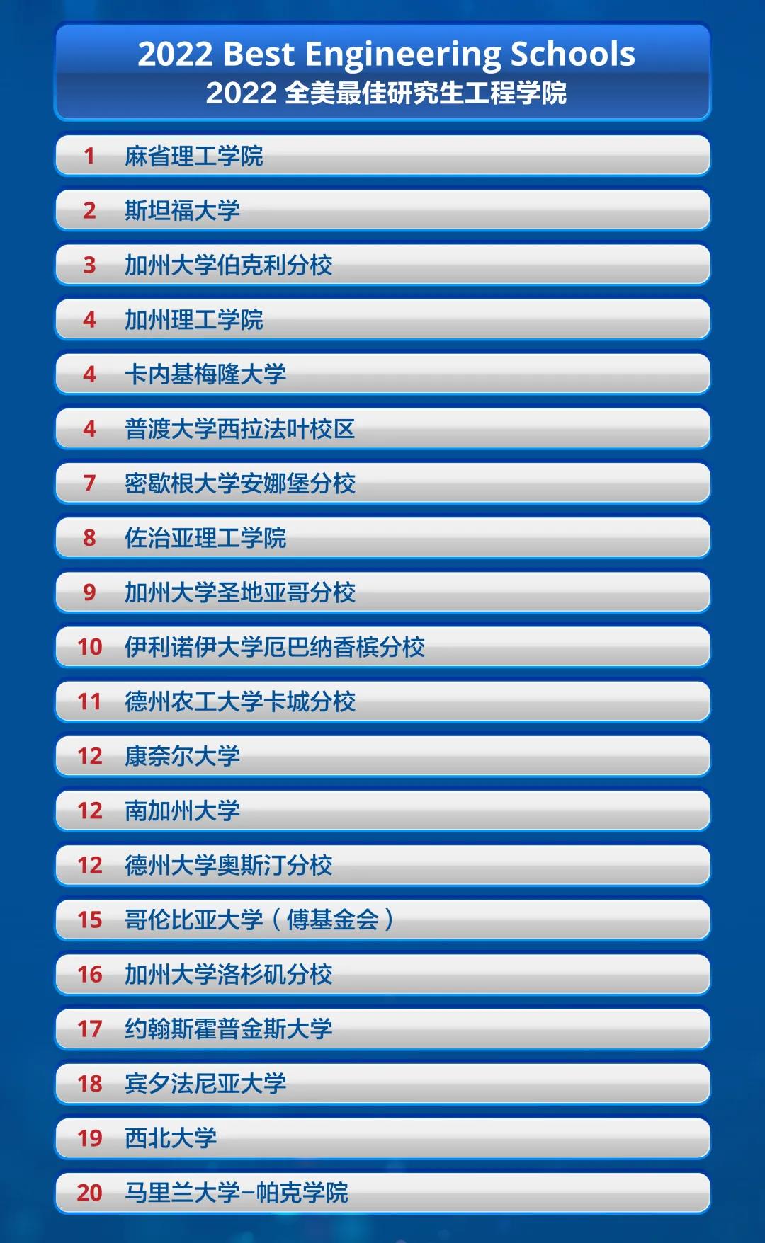 工程学院整体排名没有太大变化,TOP 3仍然被三大名校麻省理工学院、斯坦福大学、加州大学伯克利分校占据,康奈尔大学上升至第12位。